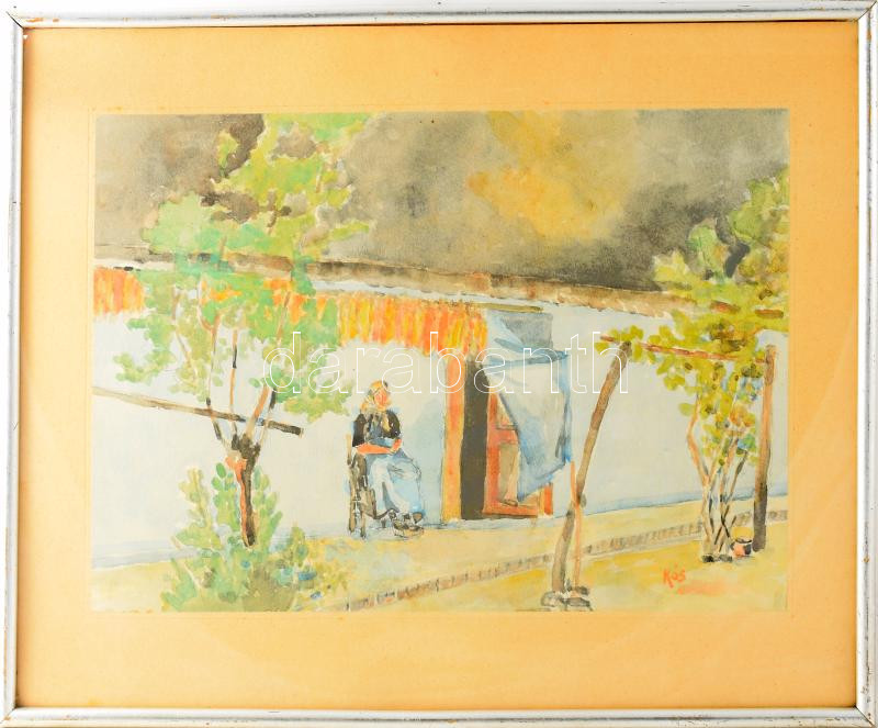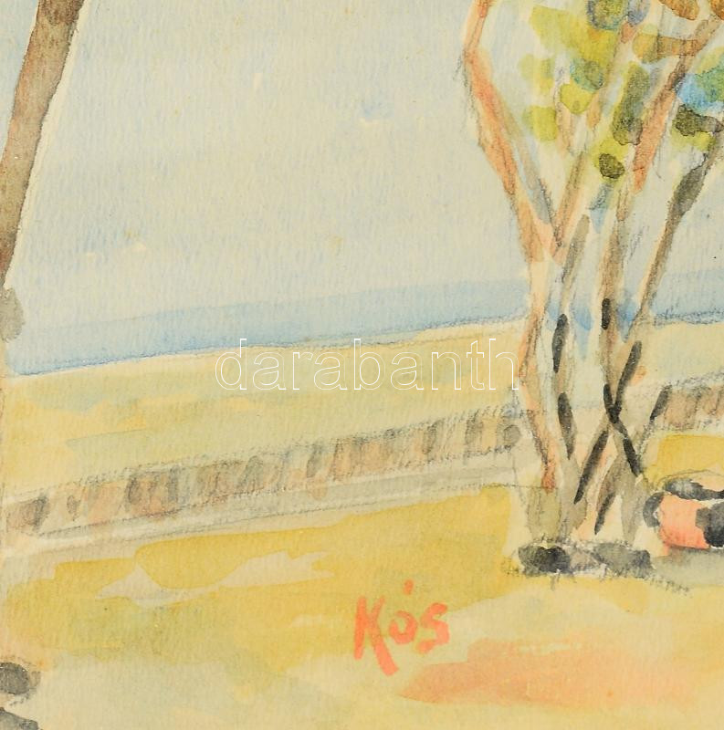 Kós jelzéssel (Kós Géza bajai festő?): Pihenő. Akvarell, papír, üvegezett kopott fakeretben, hátoldalán Karbuczky Jenő bajai üveg és porcelán kereskedő régi bélyegzőjével, 28x40,5 cm