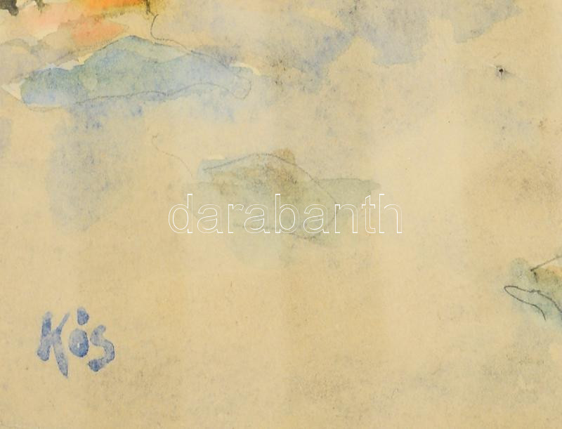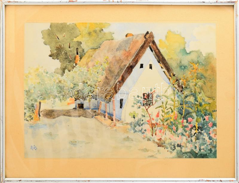 Kós jelzéssel (Kós Géza bajai festő?): Virágzó kert. Akvarell, papír, üvegezett kopott fakeretben, hátoldalán Karbuczky Jenő bajai üveg és porcelán kereskedő régi bélyegzőjével, 28x37,5 cm