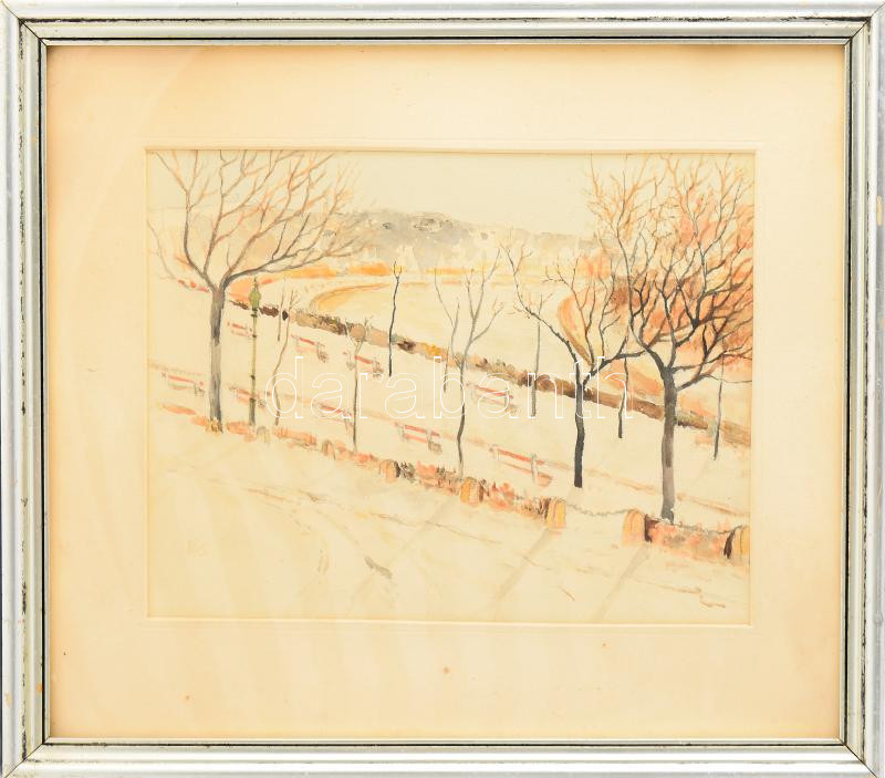 Leírás: Kós jelzéssel (Kós Géza bajai festő?): Vízparti hangulat. Akvarell, papír, üvegezett kopott fakeretben, 22,5x29 cm