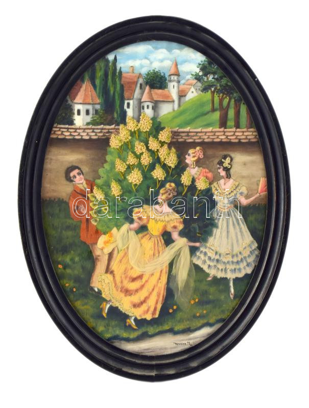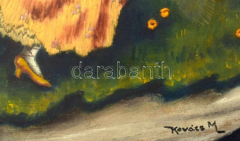 Leírás: Kovács M jelzéssel: Három grácia és az udvarló. Olaj, vászon, szövet. 34×24,5 cm. Üvegezett fakeretben.