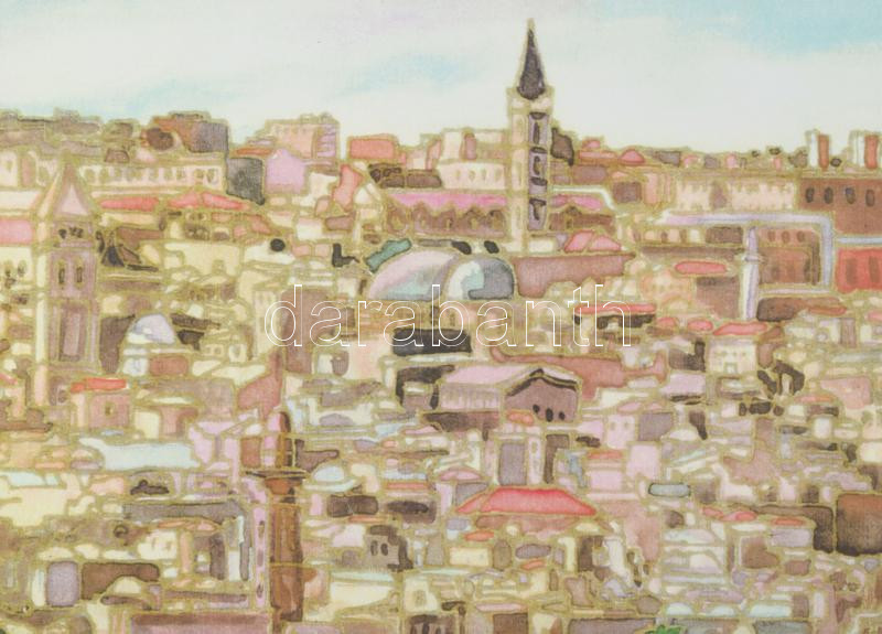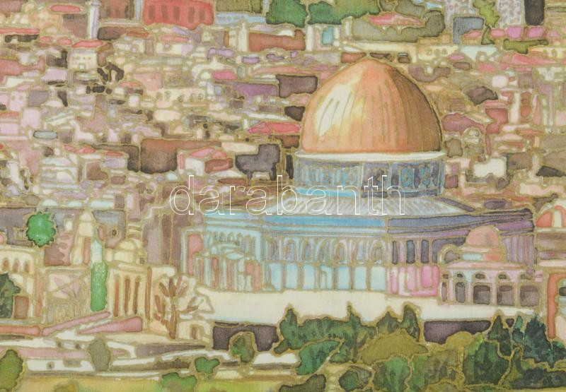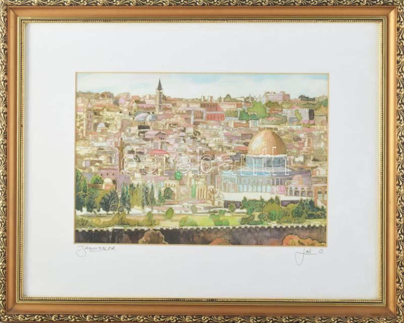 Leírás: Lavi jelzéssel: Jeruzsálem látképe. Ofszet nyomat, papír. Dekoratív, üvegezett fakeretben. 19x28 cm