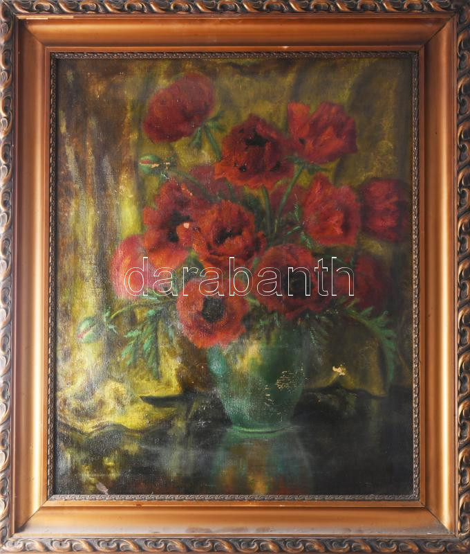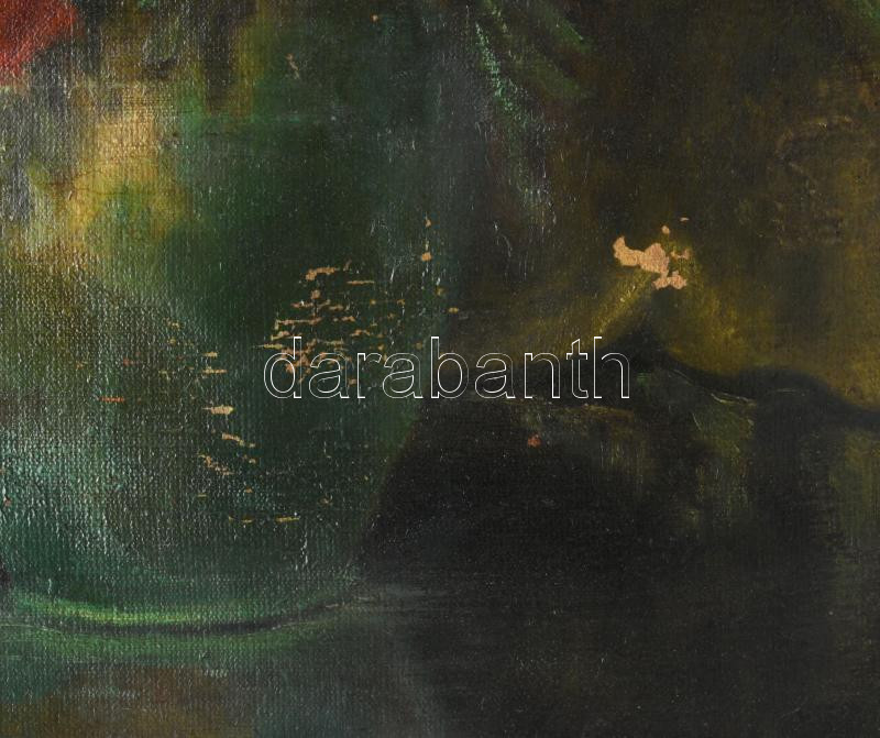 Leírás: Olvashatatlan jelzéssel: Csendélet. Olaj, vászon. Kisebb felületi sérülésekkel (festék lepergésekkel). Dekoratív, kissé sérült fakeretben, 71x60 cm.