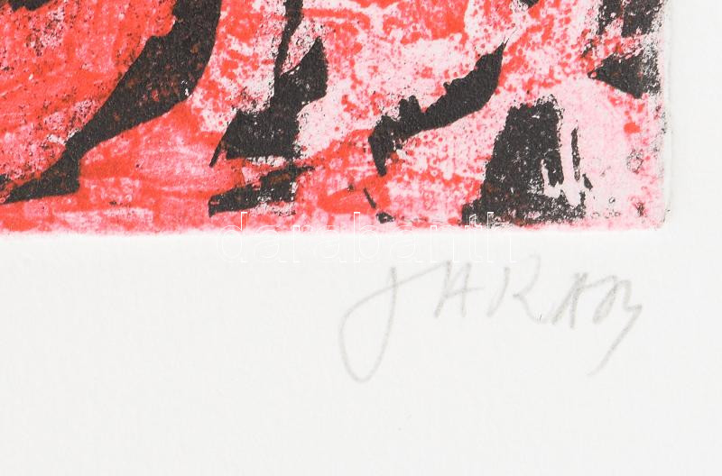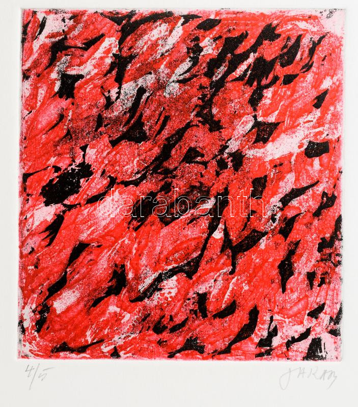 Leírás: Olvashatatlan jelzéssel: Piros-fekete áramlás (cím nélkül). Színes rézkarc, papír, jelzett, számozott (4/5). 15×14 cm