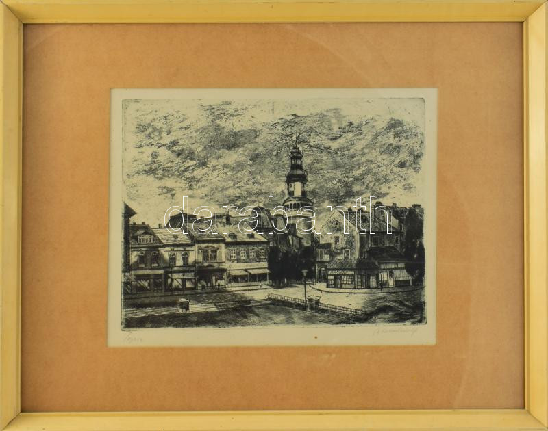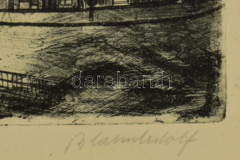 Leírás: Blahos Rudolf (1917-1986): Sopron. Rézkarc, papír, jelzett, 23×29 cm. Üvegezett fakeretben.