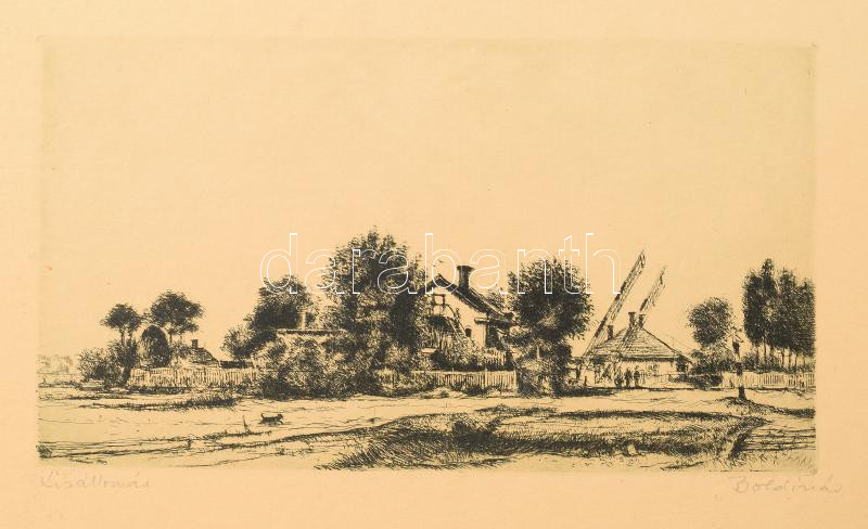 Boldizsár István (1897-1984): Kis állomás (vasúti állomás). Rézkarc, papír, jelzett, kartonra kasírozva, lapszéli kissebb elszíneződésekkel, 15×27,5 cm