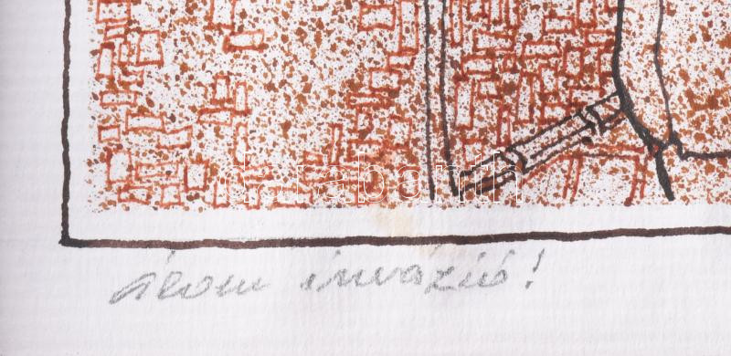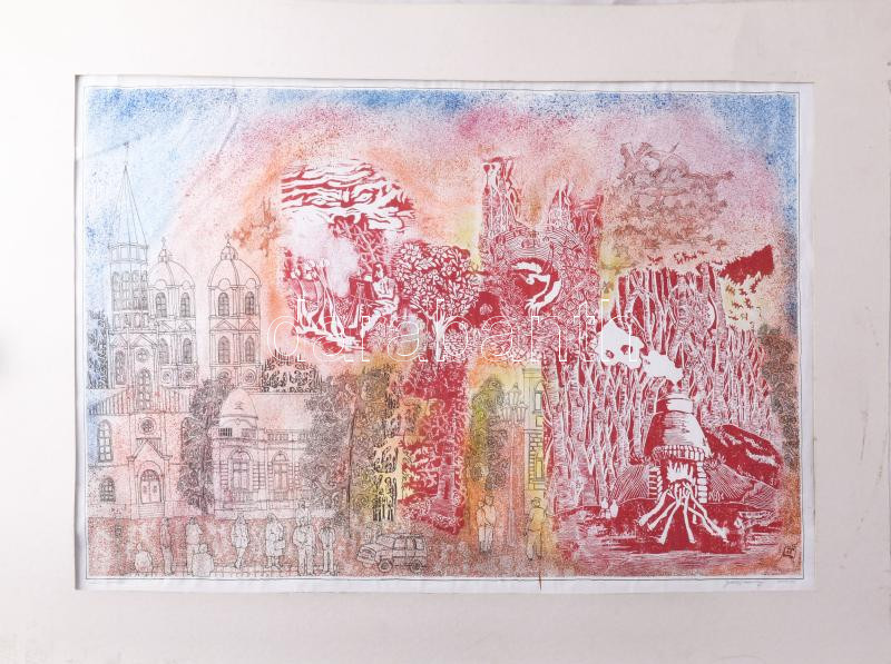 Leírás: Botrágyi Károly (-): Álom invázió! Vegyes technika, nyomat, papír. Jelzett. Sérült. Paszpartuban. 44x64 cm