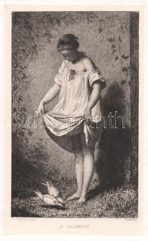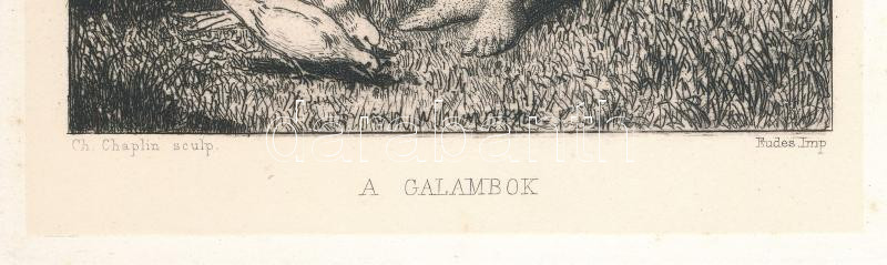 Charles Joshua Chaplin (1825-1891): A galambok. Rézkarc, papír, jelzett a karcon. Az 1884-ben megjelent Életképek. Jelenkori művészek találkozója. Husz rézkarcz c. mappából. Lapszéli apró foltokkal. 20x12 cm