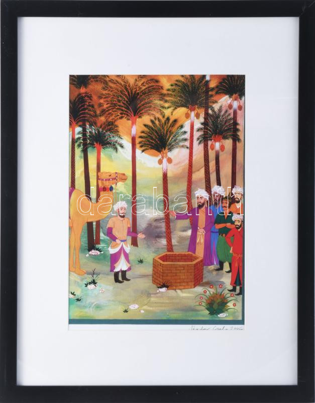 Leírás: Csala Sándor (1975-): Történet Naszreddin Hodzsáról. Ofszet nyomat, papír, jelzett. Üvegezett fakeretben. 27,5x19 cm.