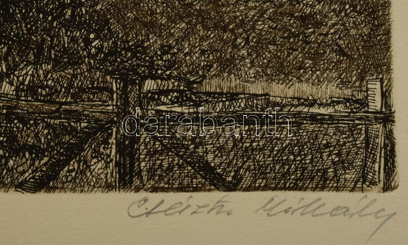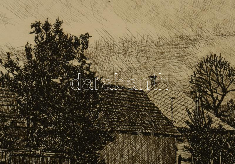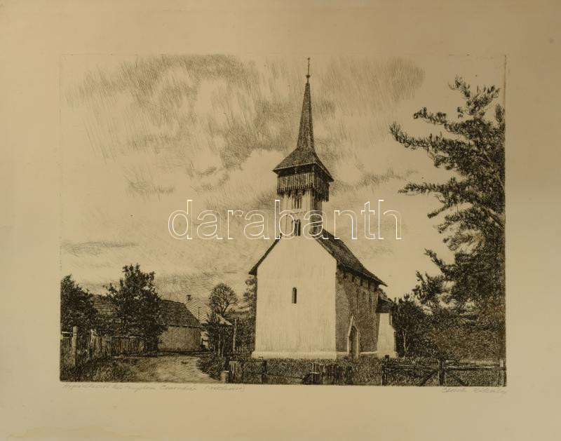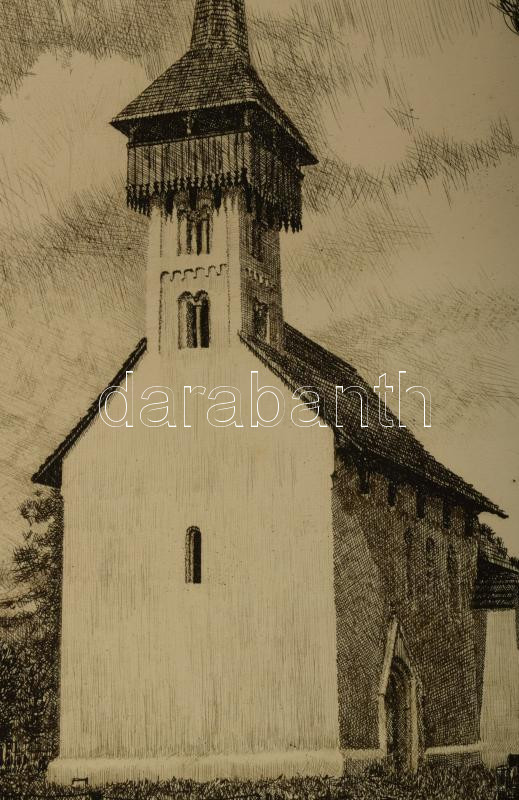 Leírás: Csisztu Mihály (1933-2008): Árpádkori kistemplom Csarodán. Rézkarc, papír, jelzett, próbanyomat IV bélyegzéssel a hátoldalán, feltekerve, 29,5x39,5 cm