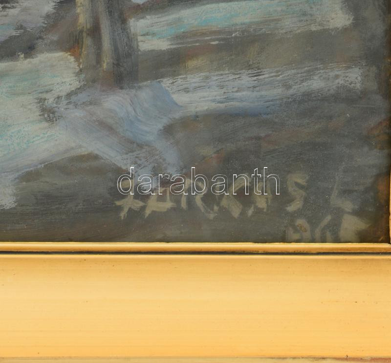 Leírás: Farkas Lajos (1919-1998): Hegyoldal. Olaj, farost. Jelzett. Hátoldalán Képcsarnok Vállalat címkéjével. Üvegezett fakeretben, üveg sérült. 60x80 cm