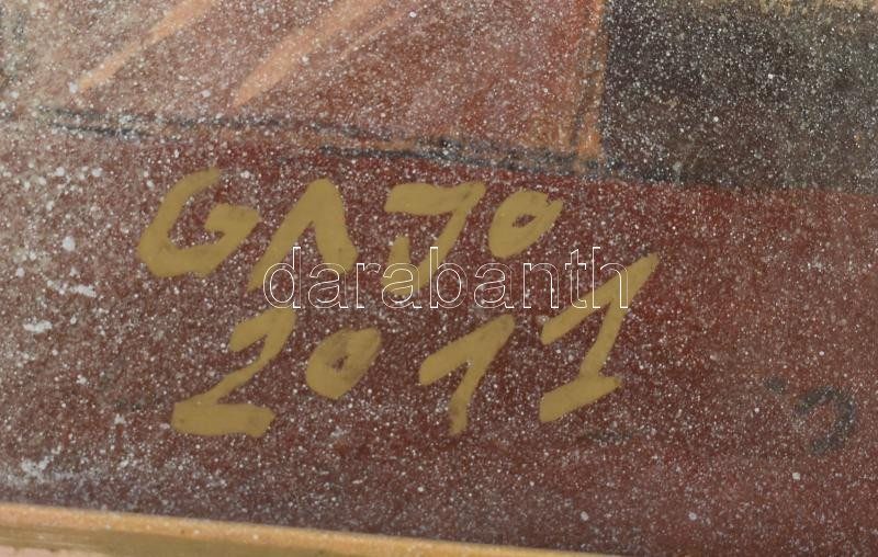 Leírás: Gábor József (Gajó, 1959-): "Ad astra", 2011. Olaj, farost. Jelezve jobbra lent. Felső sarkaiban kisebb sérülésekkel. Fakeretben. 53x34 cm.