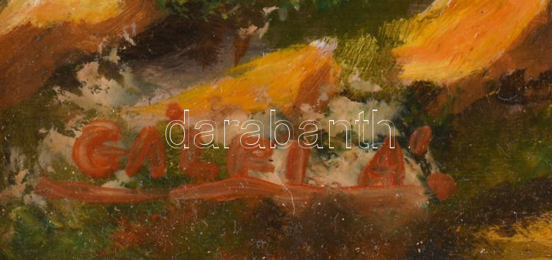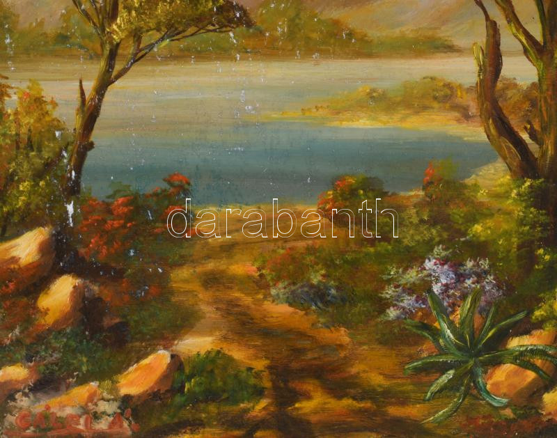 Leírás: Gálfi Ákos (1947-): Vízparti táj. Olaj, farost, jelzett, fakeretben, 30×20 cm