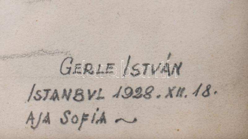 Leírás: Gerle István (XX. sz. első fele): Aja Sofia, Istanbul, 1928. Ceruza, papír, jelzett, üvegezett fakeretben, 35×23,5 cm