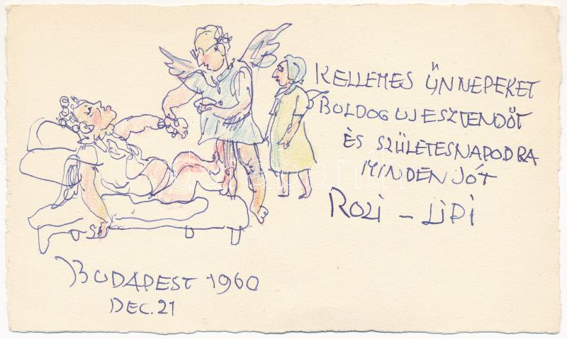 Hermann Lipót (1884-1972): A szárnyas orvos, 1960. Golyóstoll, ceruza, papír, jelzett, Hermann Lipót autográf újévi és születésnapi köszöntő soraival. Lapszéli apró folttal. 9,5x15,5 cm