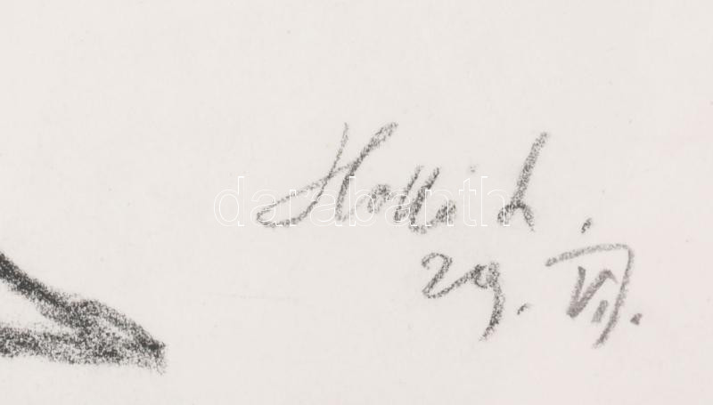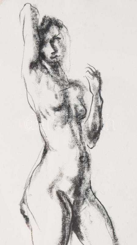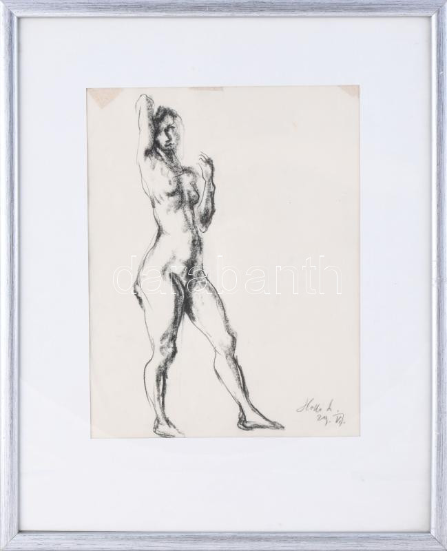 Leírás: Holló László (1887-1976): Álló női akt. Szén, papír, jelzett. Lap tetején paszpartuzás nyomaival. Üvegezett fakeretben, 29x22,5 cm