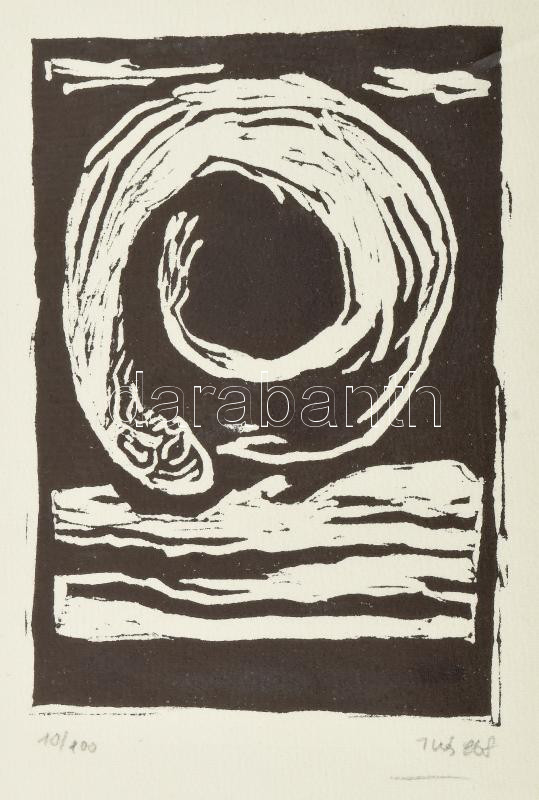 Leírás: Illés Árpád (1908-1980): Körforgás (cím nélkül). Linómetszet, papír, jelzett. Számozott: 10/100. 15x11 cm