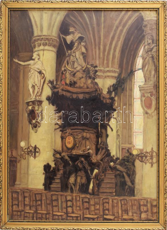 Leírás: Káró Géza (1907-): Brüsszeli Szent Mihály és Szent Gudula-székesegyház belseje. Olaj, falemez, jelezve jobbra lent, 49x35 cm. Régi fakeretben.