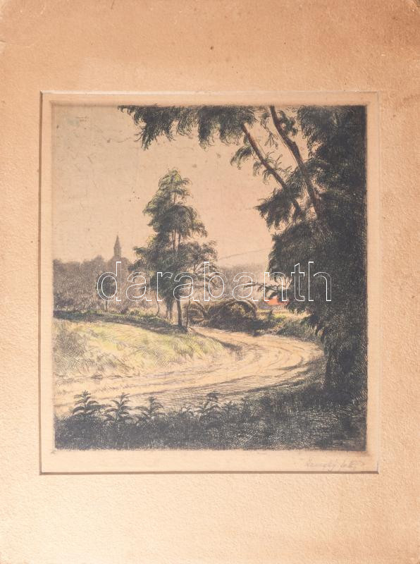 Leírás: Kaveczky Zoltán (1897-1965): Kanyargó út (cím nélkül). Színezett rézkarc, papír, jelzett, paszpartuban, 24×22 cm