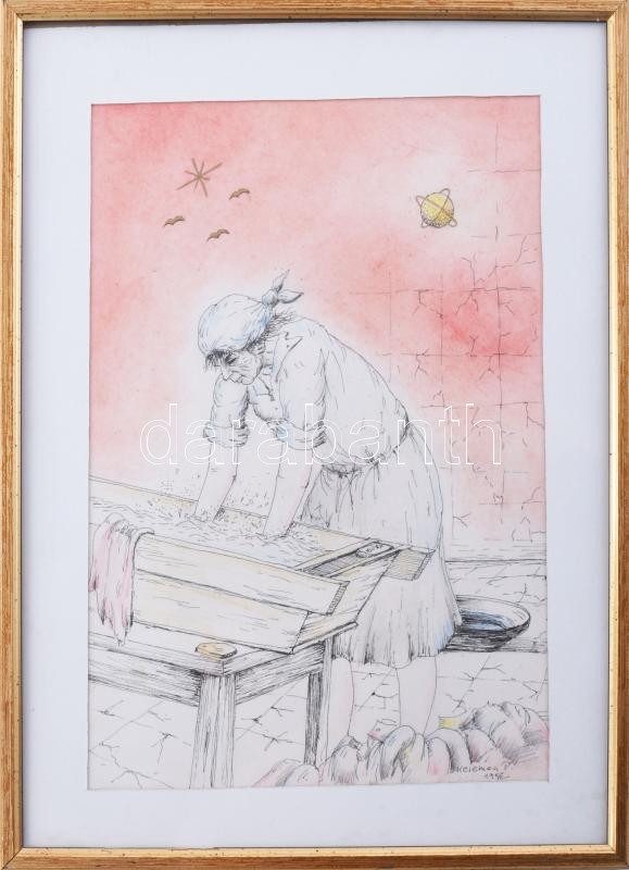 Kelemen Pál (1942-1999): Szürrealista kép, 1996. Akvarell, tus, papír,... https://www.darabanth.com/hu/514-Festmeny-grafika-plakat-ex-libris-arveres/516.0/Festmenyek-es-grafikak/Festmenyek-es-grafikak~8/Kelemen-Pal-1942-1999-Szurrealista-kep-1996-Akvarell-tus-papir-jelzett-Uvegezett-faker~II3464322