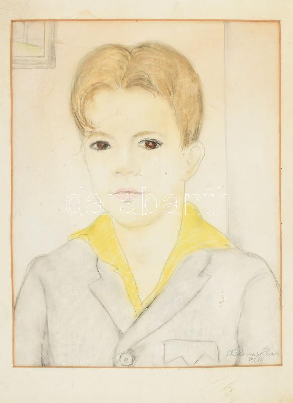Leírás: Kliené Róna Klára (1901-1987): Kisfiú portréja, 1937. Pasztell, ceruza, papír, jelzett, paszpartuban. 40,5×31,5 cm.