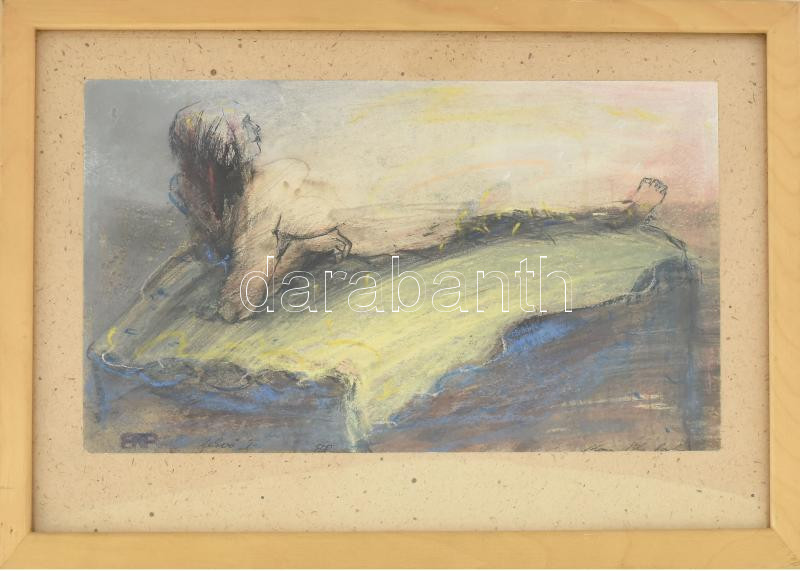 Kovács Péter Balázs (1955-): Fekvő akt I., 1979. Pasztell, tus, papír, jelzett. Hátoldalán autográf felirattal. Plexiüvegezett fakeretben. 21,5x33,5 cm
