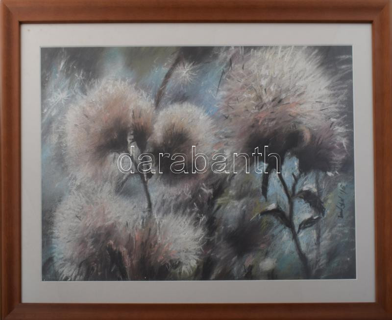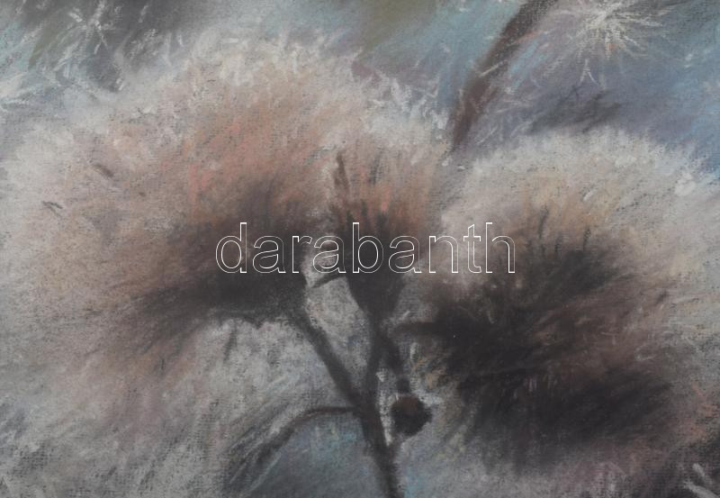 Leírás: Máté Sándor (1954-): Pitypangok. Pasztell, papír. Jelzett. Üvegezett fakeretben, 30,5x47,5 cm