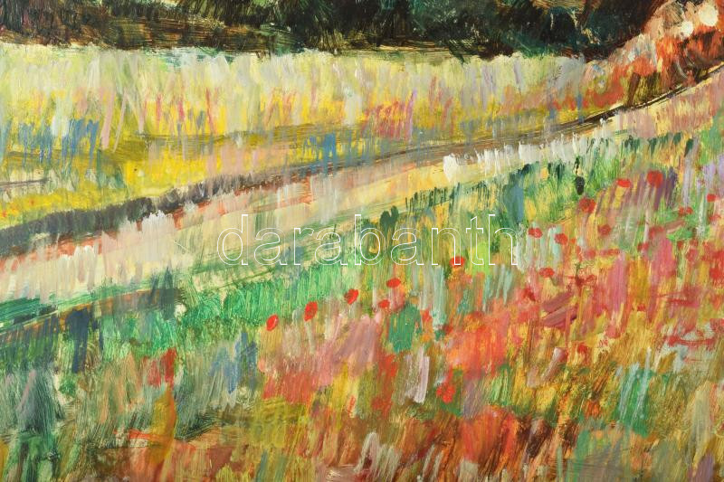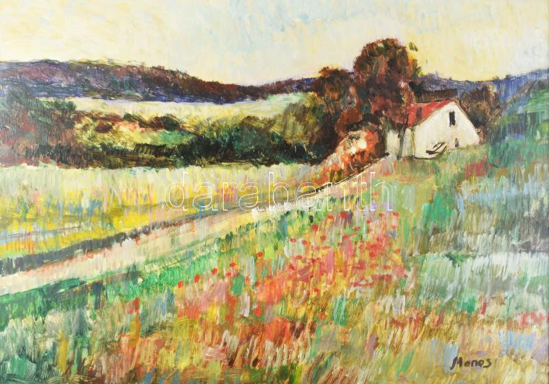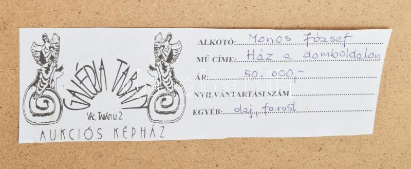 Leírás: Monos József (1932-2013): Ház a domboldalon. Olaj, farost, jelzett. Hátoldalán Galéria Tabán címkéjén feliratozott. Dekoratív fakeretben. 50×70 cm
