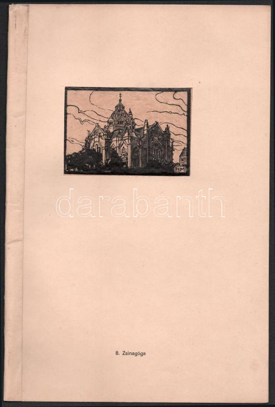 Mühlfeith János (működött a XX. sz. első felében): Zsinagóga (Szeged), 1919. Fametszet, hártyapapír, jelzett a metszeten. Paszpartuban, paszpartu szélén hajtásnyommal. 7x10 cm