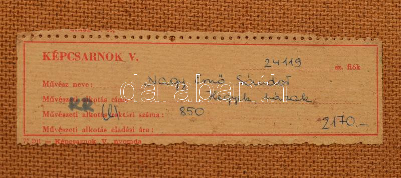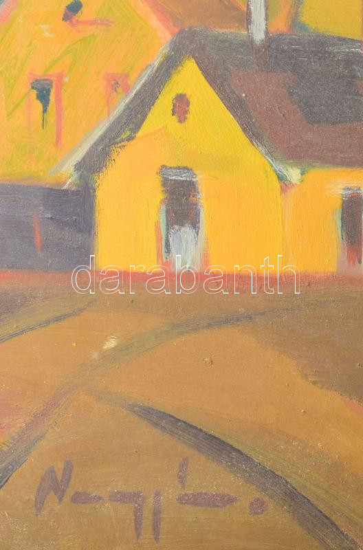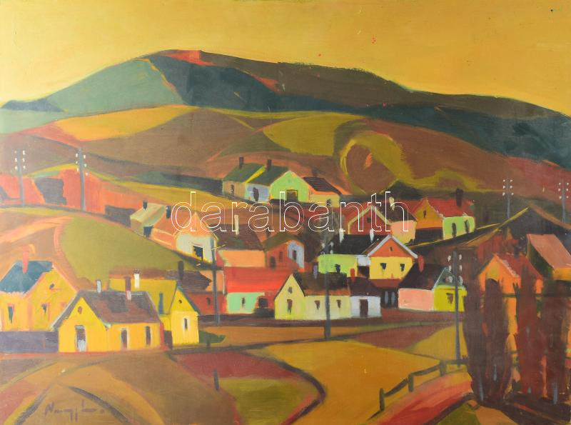Nagy Ernő Sándor (1926-2013): Hegyek, házak, 1970-es évek vége. Olaj, farost. Jelzett. Hátoldalán autográf felirattal és Képcsarnok Vállalat címkéjével. 60×80 cm.