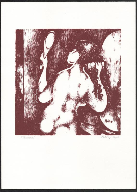 Leírás: Petőcz Lajos (1919-2009): Fésülködő. Nyomat, papír, jelzett, 19,5x19,5 cm.