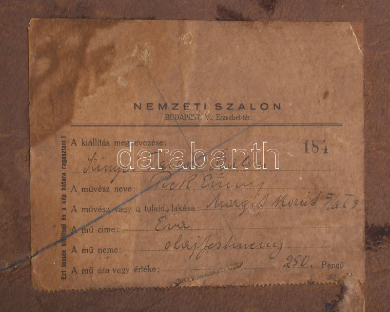 Leírás: Pick Emmy (1900 - ?): Éva (női portré). Olaj, karton, jelezve jobbra lent. Hátoldalán Nemzeti Szalon 1930 körüli raglapjával. Proveniencia: Saphier-gyűjtemény. Sérült. 75x62 cm