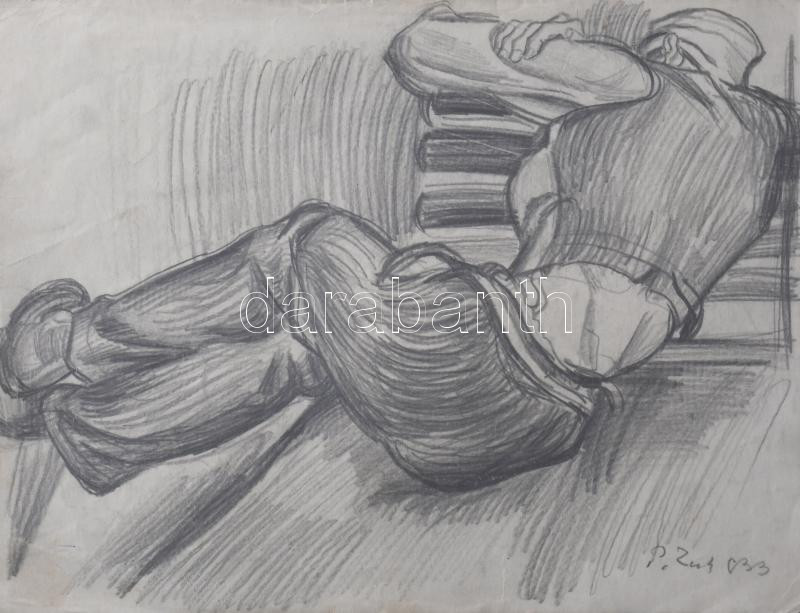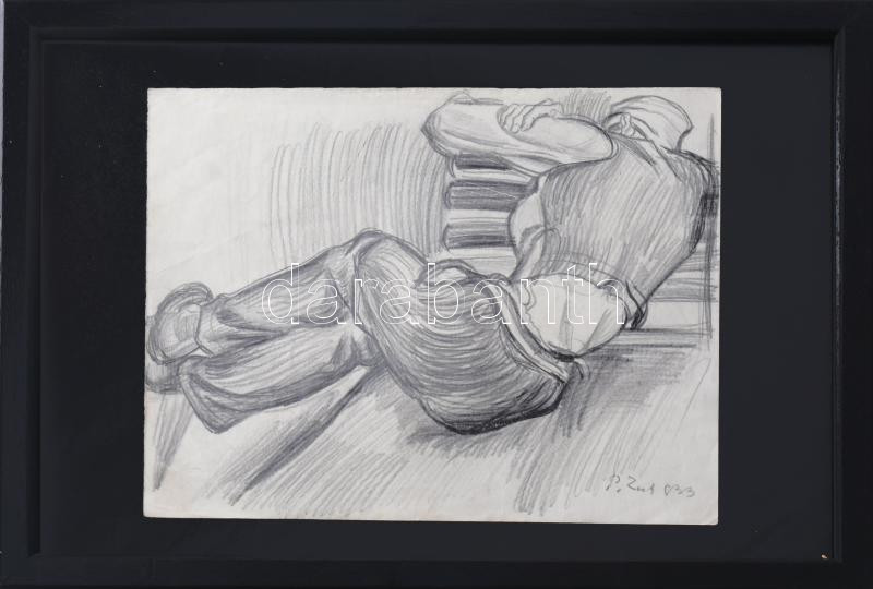 Leírás: Pituk József Viktorián (1906-1991): Pihenés. Ceruza, papír, jelezve jobbra lent, üvegezett fakeretben, 18x21 cm