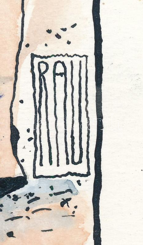 Leírás: Rau Tibor (1934-2009): A szónok (cím nélküli karikatúra). Akvarell, tus, papír, jelzett. 25x19,5 cm