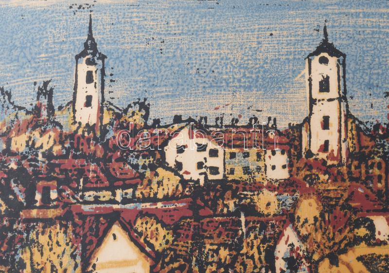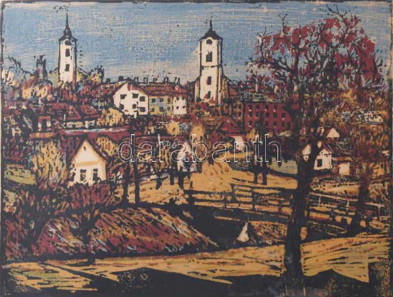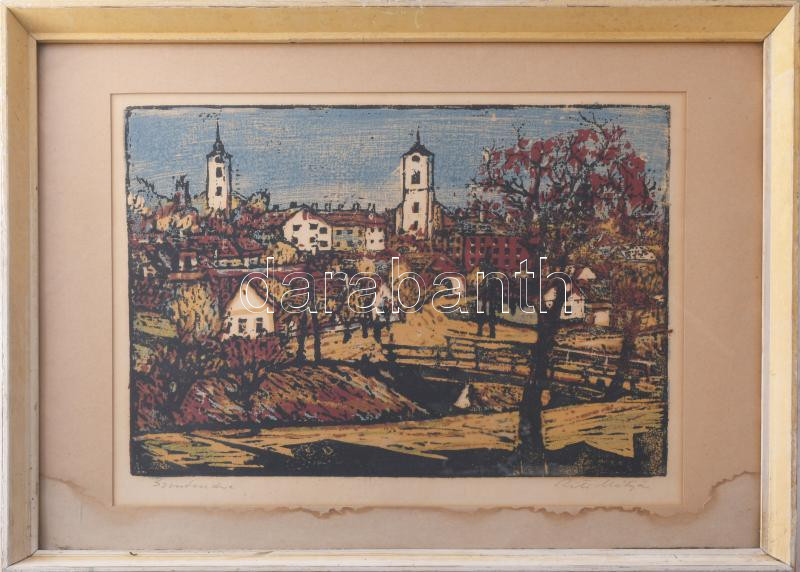 Leírás: Réti Mátyás (1922-2002): Szentendre. Színes linómetszet, papír, jelzett, paszpartun ázásnyommal. Üvegezett fakeretben. 28×36 cm
