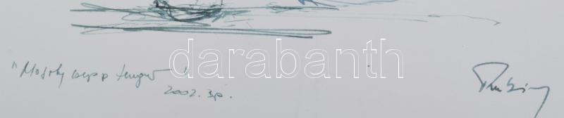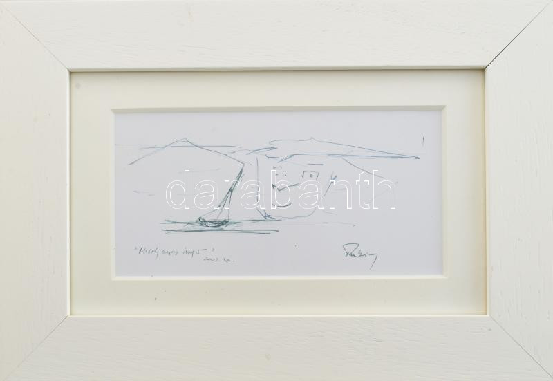 Leírás: Rubint Ávrahám Péter (1958-): Mosoly csepp tenger, 2002. Tus, toll, papír, jelezve jobbra lent, üvegezett keretben. 9,5×19 cm