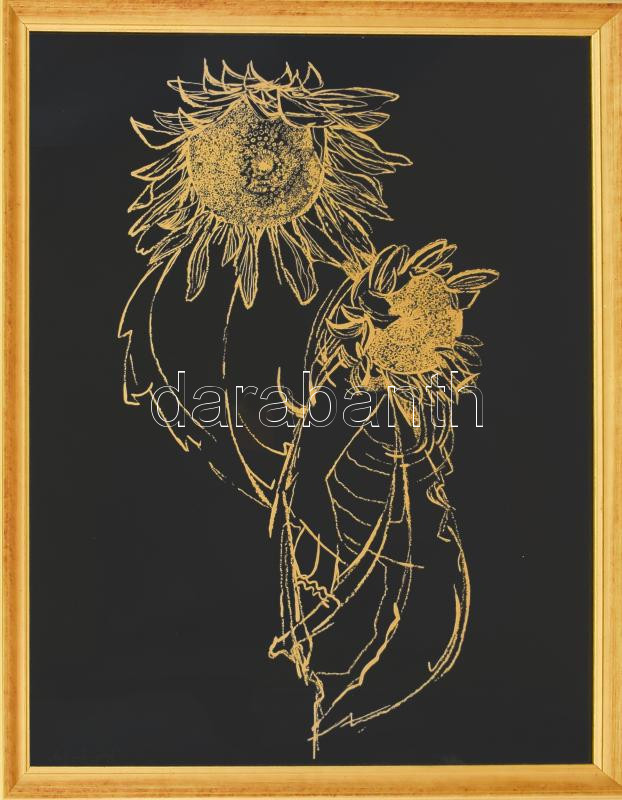 Leírás: Szántó Piroska (1913-1998): Napraforgók, 1986. Szitanyomat, papír, jelezve jobbra lent. Üvegezett, dekoratív fakeretben. 63,5x48 cm