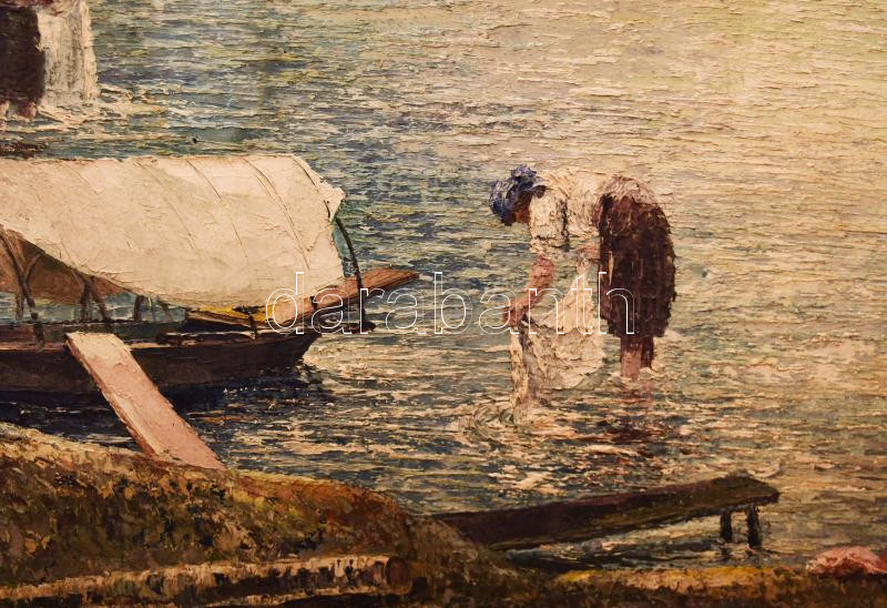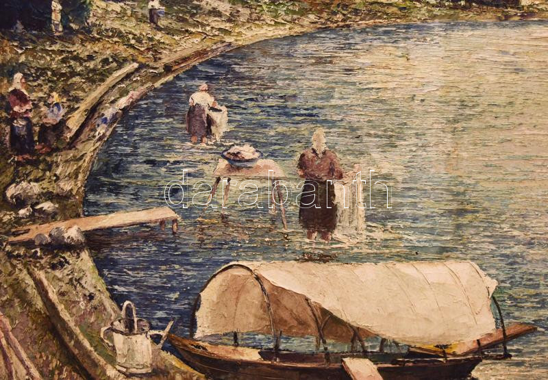 Tihanyi János Lajos (1892-1957): Vízparti élet. Olaj, karton, jelzett. Dekoratív, sérült fakeretben. 70x100 cm. KIZÁRÓLAG SZEMÉLYES ÁTVÉTEL, NEM POSTÁZZUK / ONLY PERSONAL COLLECTION IN OUR OFFICE!