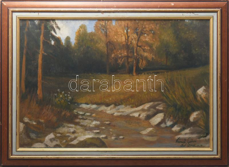 Leírás: Váradi Gábor (1958-): Erdei táj. Olaj, vászon. Jelzett, sérült 64x43 cm. Dekoratív, kissé kopott fakeretben.