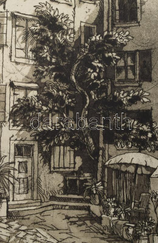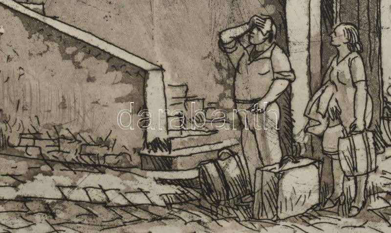 Leírás: Varga Mátyás (1910-2002): Kirándulás, 1979. Rézkarc, papír, jelzett, paszpartuban, 24×30 cm