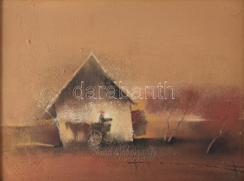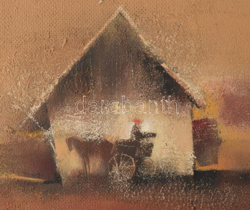 Leírás: Várkonyi János (1947-): Tanyán, 1984. Olaj, farost. Jelzett. A hátoldalán autográf felirattal. Fakeretben, 30×40 cm