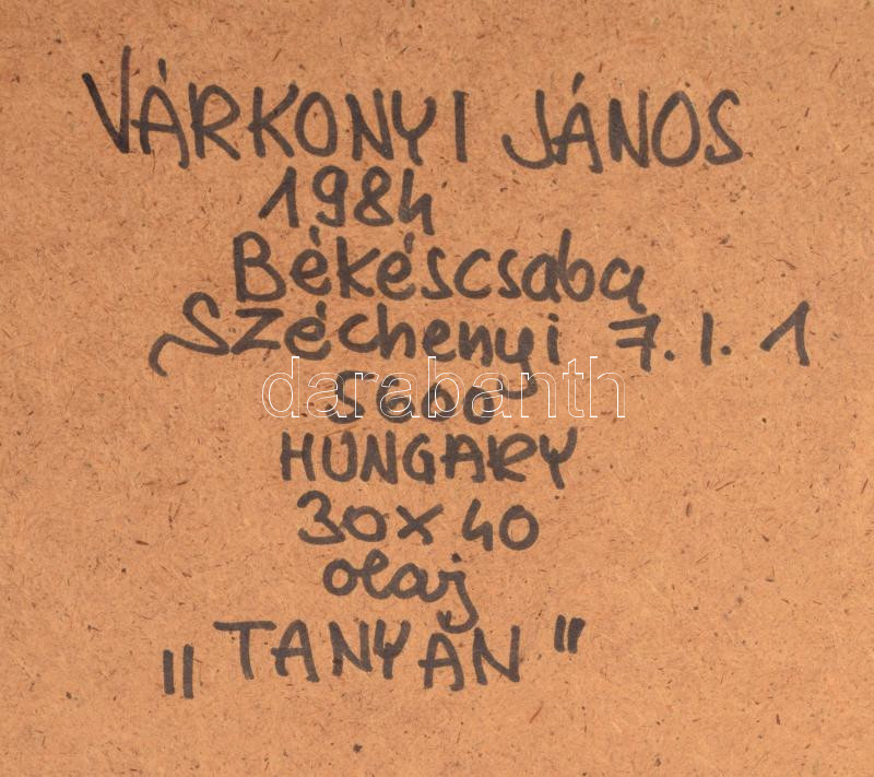 Várkonyi János (1947-): Tanyán, 1984. Olaj, farost. Jelzett. A hátolda... https://www.darabanth.com/hu/514-Festmeny-grafika-plakat-ex-libris-arveres/516.0/Festmenyek-es-grafikak/Festmenyek-es-grafikak~8/Varkonyi-Janos-1947-Tanyan-1984-Olaj-farost-Jelzett-A-hatoldalan-autograf-felirattal~II3459679