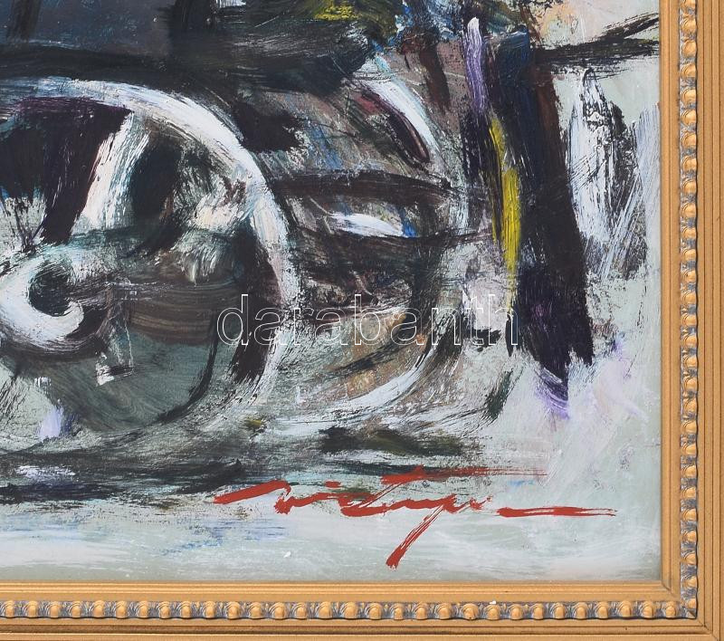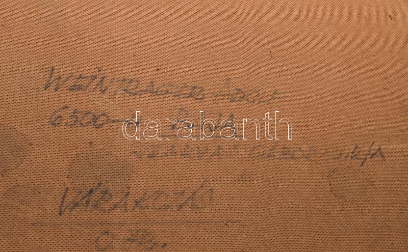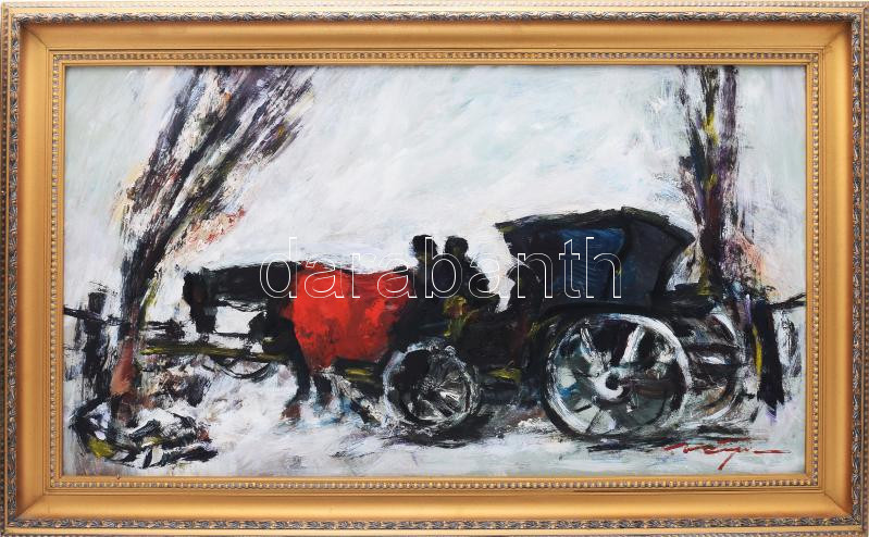 Weintrager Adolf (1927-1987): Várakozás (Lovak). Olaj, farost, jelezve jobbra lent, hátoldalán Weintrager Adolf autográf feliratával. Dekoratív, kissé kopott fakeretben, 50×90 cm. KIZÁRÓLAG SZEMÉLYES ÁTVÉTEL, NEM POSTÁZZUK! / ONLY PERSONAL COLLECTION AT OUR OFFICE.