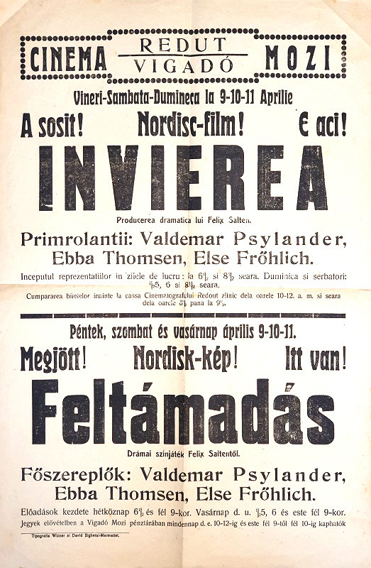 Holger Madsen (1878-1943) dán rendező a némafilmes korszak kezdetén a skandináv filmgyártás ötletgazdag szakembere volt. Háborúellenes melodrámái és tudományos-fantasztikus filmjei az első világháború előtt és alatt jelentős figyelmet keltettek. Felix Salten osztrák író forgatókönyve alapján 1915-ben mutatták be "En opstandelse" (Feltámadás) című mozgóképét, a budapesti mozikba a film 1916 augusztusában jutott el. Évszámjelzés nélkül megjelent moziplakátunk készülhetett ugyan a budapesti premier évében is, ám moziplakátunk román (és csak kiegészítően magyar) nyelvű megszövegezése, illetve nyomdájának román megnevezése arra utal, hogy a film Máramarosba csak a román megszállás után, a román adminisztráció megszilárdulását követően jutott el.