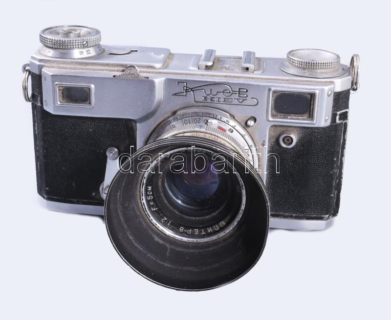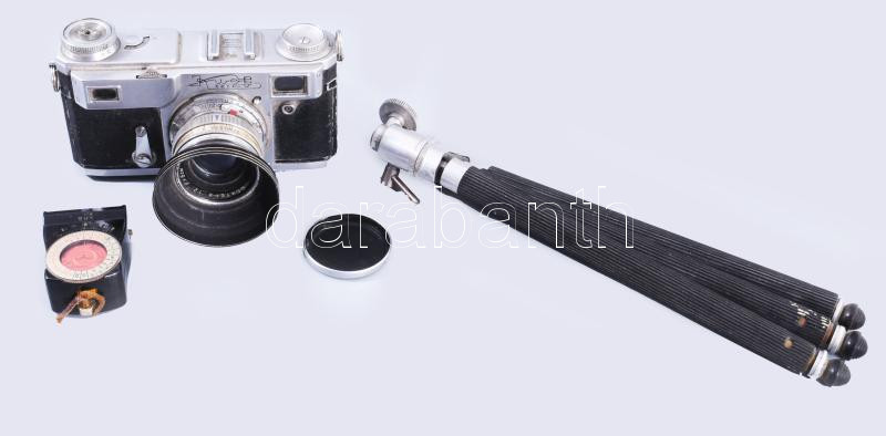 cca 1960 Kiev (Kijev) 4 szovjet gyártmányú fényképezőgép, 35 mm filmformátum, Jupiter-1,8M f:/50 mm objektívvel, hozzá állvány és fémymérő tokkal