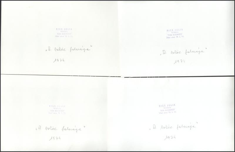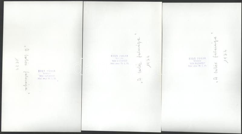 Leírás: 1974 A bohóc felesége (r: Nemere László) c. film forgatásán készült 7 db filmfotó. Kiss Júlia pecséttel jelzett alkotásai 24x15 cm