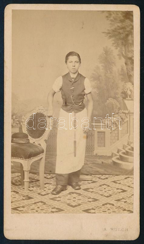 Leírás: cca 1868 Hentesfiú portréja, keményhátú fotó Bülch Ágoston pesti műterméből, 10,5×6,5 cm