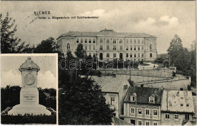Leírás: 1906 Mimon, Niemes; Volks- und Bürgerschule mit Friedrich Schillerdenkmal / school and monument