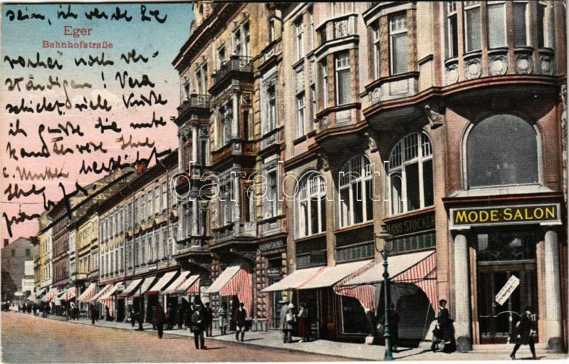 Leírás: Cheb, Eger; Bahnhofstraße, Mode-Salon / street view, fashion store, shops of Hans Stocker and Kaspar Gruber