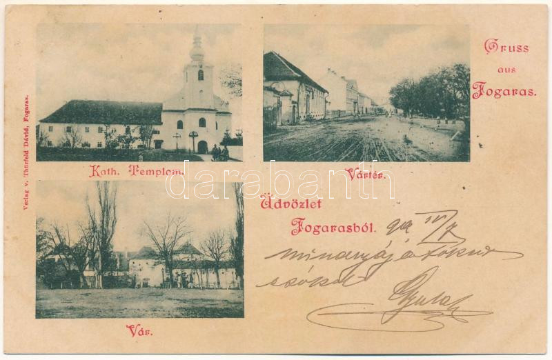 Leírás: 1899 Fogaras, Fagaras; Vár, katolikus templom, vártér. Kiadja Thürfeld Dávid / castle, Chatolic church, square (fl)