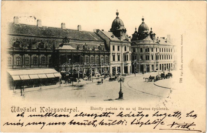 1900 Kolozsvár, Cluj; Bánffy palota és az új Status épületek, Böckel, Jeney Lajos, Reményik L. és Fiai üzlete. Rigó Árpád kiadása 798. / palace, shops (EK)